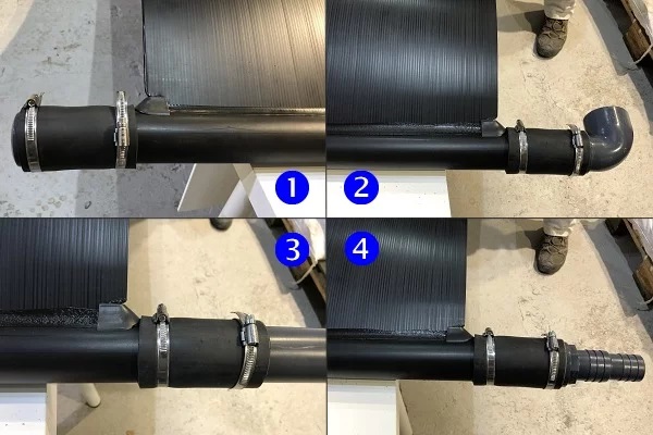 De zijbuizen van het paneel hebben een buitendiameter van 50 mm. Er zijn in totaal 4 gaten voor verwarming, waarvan er 2 moeten worden geblindeerd en 2 moeten worden aangesloten op het filtercircuit. Voor beide gevallen wordt een stuk rubberen slang met een inwendige diameter van 50 mm gebruikt, dat op de uitlaat van de verwarming wordt geschoven en met een spanband wordt vastgezet. Het volgende wordt vervolgens in het andere uiteinde van de rubberen koppeling gestoken: