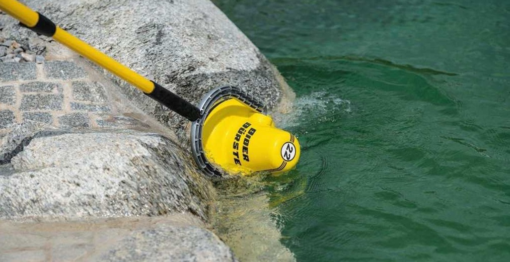BIBER 22 VIJVERBORSTEL met telescoop steel GRP uitschuifbaar 2,5 - 5,0 m, schakelunit, 2x Li-Ion accuset en 1x gele en 1x rode borstel, Dirt Safe.