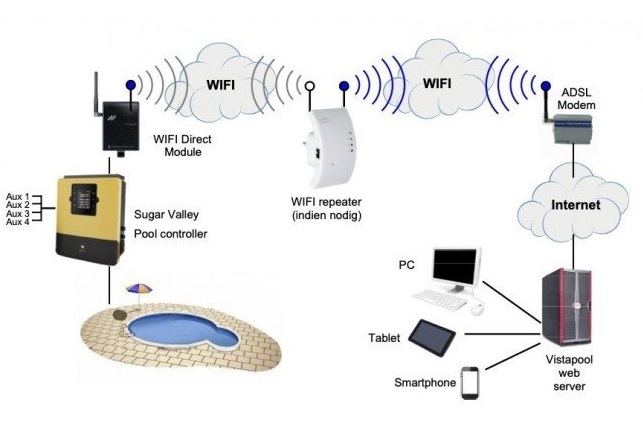 Een onmisbare uitbreiding wanneer u het maximale uit uw Sugar Valley systeem wilt halen. De WiFi-module stelt u in staat om van afstand inzicht te krijgen in de waterkwaliteit en dit vervolgens bij te stellen. Doordat op een Sugar Valley systeem ook een warmtepomp, zwembadpomp of verlichting aangesloten kan worden, zijn deze ook op afstand te bedienen. Met Vista Pool kunt u dit overal ter wereld doen. De WiFi-module maakt verbinding met uw modem, welke verbinding zoekt met de Vista Pool Web Server. Hier logt u met uw smartphone, tablet of PC op in.