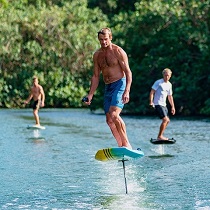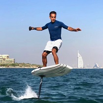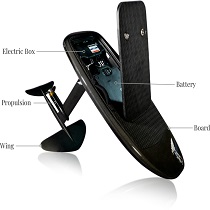 una placa eléctrica de hidroplano que te permite flotar sobre el agua a velocidades bastante altas. Usted controla el dispositivo, que está construido en gran parte de fibra de carbono, con un mando a distancia compacto.