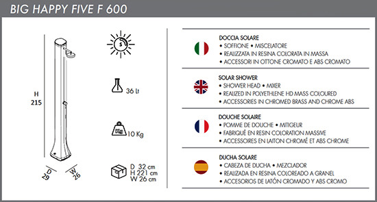 De Big Happy Five Solardouche van de Italiaanse designontwerpers Arkema Design straalt een en al rust en elegantie uit in uw tuin en is voorzien van een grote aluminium tank van maar liefst 40 liter waterinhoud en solarwerking aan binnen en buitenzijde van de douche. De watertank wordt door de straling van de zon opgewarmd, waardoor u kunt genieten van lekker warm water. Met de mengknop kunt u de watertemperatuur regelen. De kleur van de douche is leverbaar in 8 verschillende kleuren en de hoogte is 2150mm. De Big Happy Five is geschikt voor zowel binnen als buiten en kan ook worden aangesloten op een centrale verwarming. De wateraansluiting is: ½'' - ¾'' en de bevestiging van de douche geschiedt middels een sokkel met flensbevestiging op het terras. Verder is de douche ook nog voorzien van een superieure douchekop.