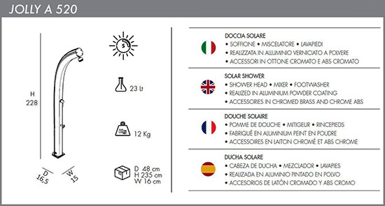 De Jolly Solardouche van de Italiaanse designontwerpers Arkema Design straalt een en al rust en elegantie uit in uw tuin en is voorzien van een grote aluminium tank van 25 liter waterinhoud en solarwerking aan binnen en buitenzijde van de douche. De watertank wordt door de straling van de zon opgewarmd, waardoor u kunt genieten van lekker warm water. Met de mengknop kunt u de watertemperatuur regelen. De kleur van de douche is leverbaar in 8 verschillende kleuren en de hoogte is 2260mm. De Jolly is geschikt voor zowel binnen als buiten. De wateraansluiting is: ½'' - ¾'' en de bevestiging van de douche geschiedt middels een sokkel met flensbevestiging op het terras. Verder is de douche ook nog voorzien van een voetenkraan en een superieure douchekop.
