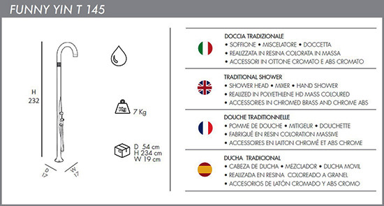 Arkema's Funny Yin design shower is een van de grootste innovaties in de poolsector. Het baanbrekende en kleurrijke ontwerp onderscheidt zich van de rest van de zwembaddouches op de markt. Het Funny Yin model is verkrijgbaar in zwart, wit, fuchsia, violet, oranje, groen en kersenrood. Laat u verleiden door de ontwerpen van Arkema en breng uw zwembad naar een hoger niveau. Hoogte: 232 cm (50 x 17 cm basis)