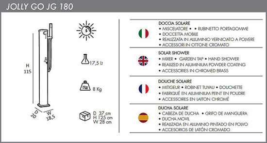 De Jolly Go JG180 Solardouche van de Italiaanse designontwerpers Arkema Design straalt een en al rust en elegantie uit in uw tuin en is voorzien van een grote aluminium tank van 17,5 liter waterinhoud en solarwerking aan binnen en buitenzijde van de douche. De watertank wordt door de straling van de zon opgewarmd, waardoor u kunt genieten van lekker warm water. Met de mengknop kunt u de watertemperatuur regelen. De kleur van de douche is leverbaar in 8 verschillende kleuren en de hoogte is 1150mm. De Jolly Go is geschikt voor zowel binnen als buiten. De wateraansluiting is: ½'' - ¾'' en de bevestiging van de douche geschiedt middels een sokkel met flensbevestiging op het terras. Verder is de douche ook nog voorzien van een superieure handdouche.