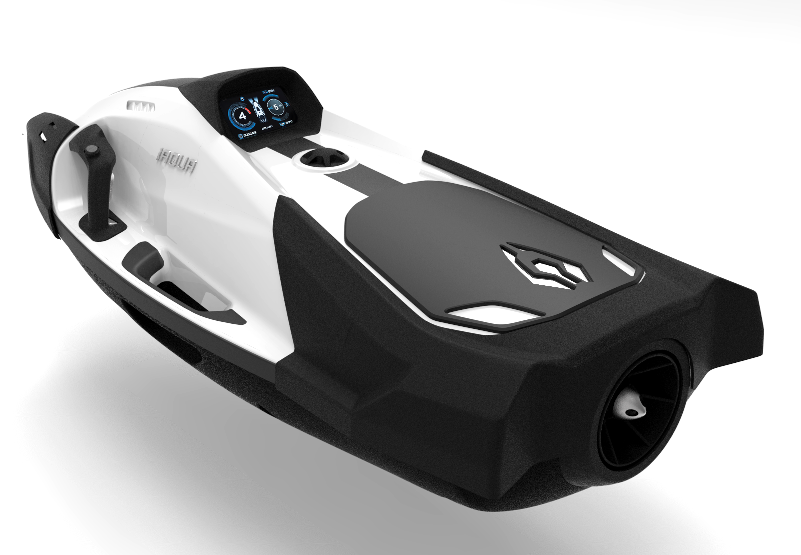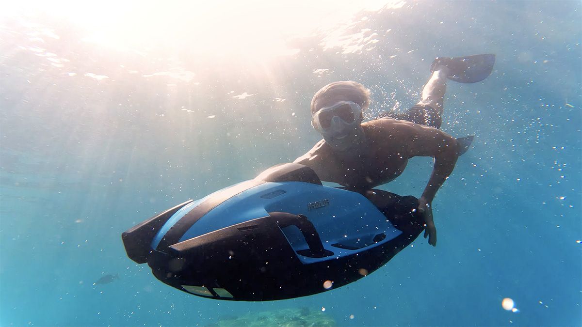 Hij kan je zowel aan de oppervlakte als onder water voortstuwen met snelheden tot 15 km/u en tot een maximale diepte van 40 meter.