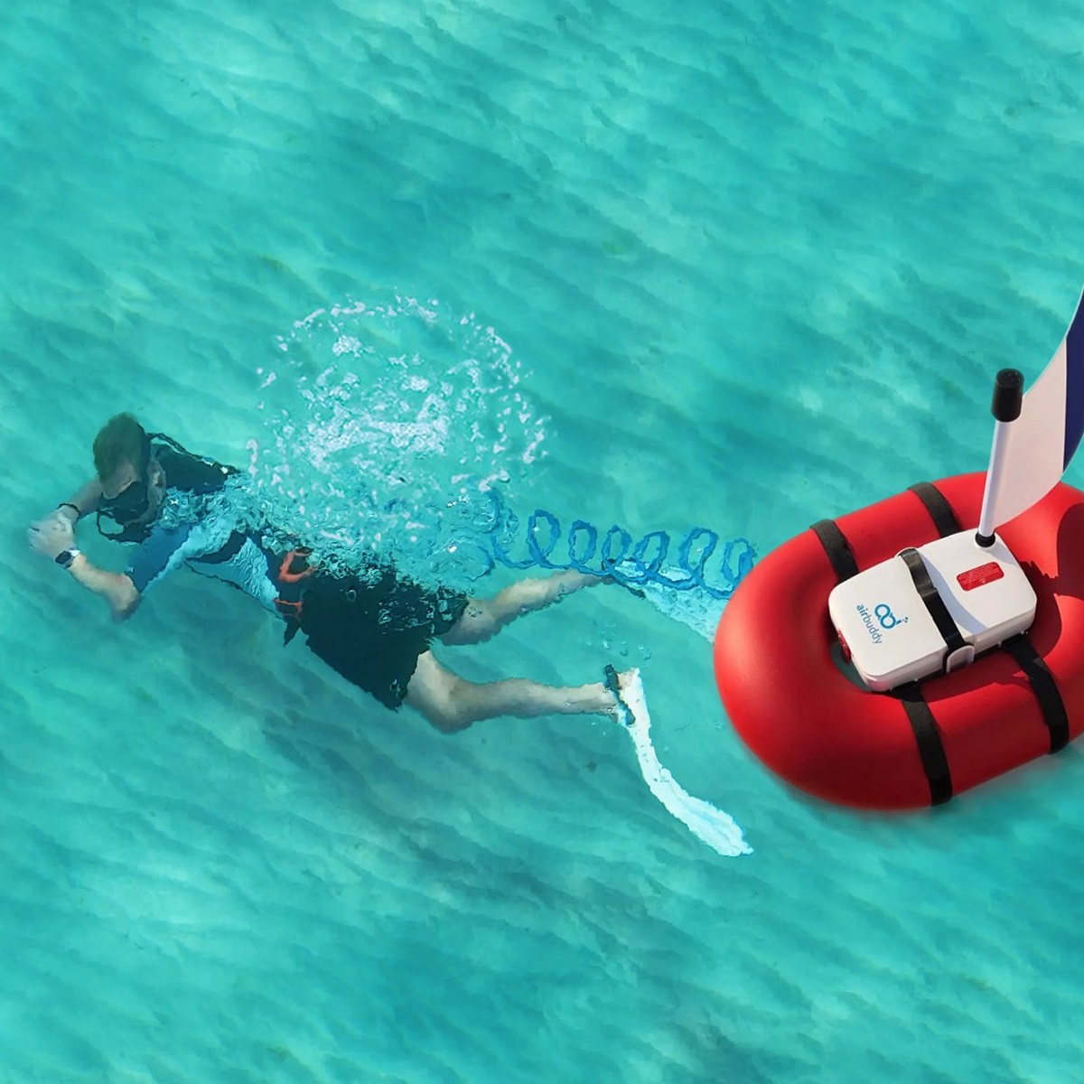 • AirBuddy glijdt gemakkelijk over het oppervlak met minimale weerstand die de duiker voelt. En de terugloopslang werkt als een "ophanging", zodat de duiker niet voelt trekken door de deining.