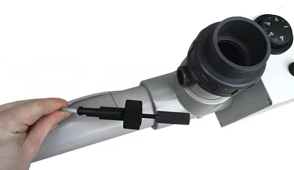De elektrische verwarming is voorzien van een doorstroomklep. Dit is een veiligheidselement dat ervoor zorgt dat als het zwembadwater niet door de heater stroomt, de verwarmingsspiraal ook niet werkt . Elektrische verwarming mag in geen geval zonder water worden gestart.