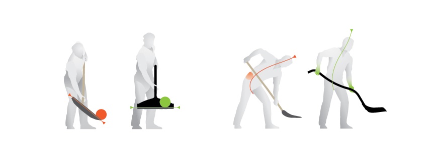 • De bocht aan het einde van het handvat dient als »roer« voor het effectief manoeuvreren en duwen van de schop.
