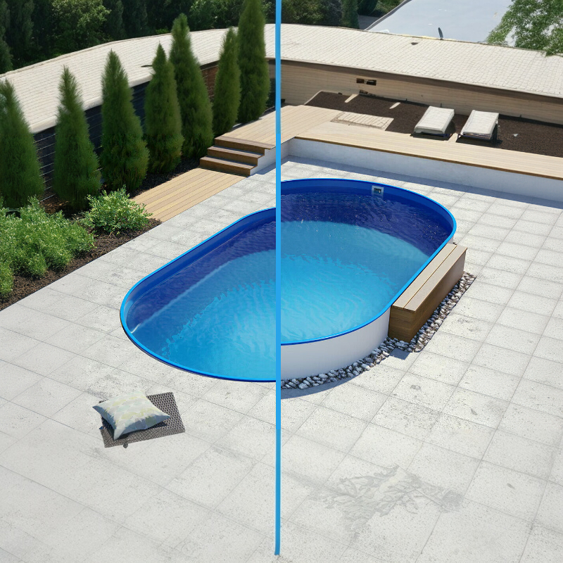 Dit Ibiza ovaalvormig dubbellaags gecoat stalen zwembad wordt geleverd met een dubbel gecoate stalen uitvoering van 0,8mm dikte, een duidelijke handleiding voor een vlotte installatie en kan optioneel worden uitgebreid met een extra dikke liner van 0.8 mm, inbouwtrap en skimmer.