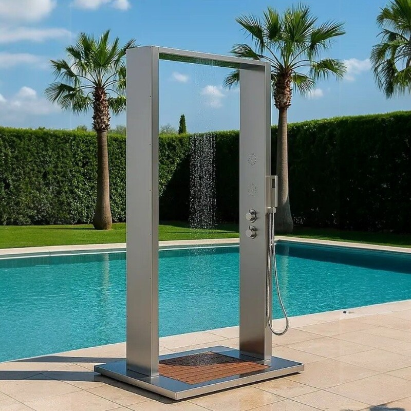 Warm of koud water kan eenvoudig worden gemengd met behulp van een drukregelaar. De brede bodemplaat is gemaakt van weerbestendig WPC en beschermt de voeten tegen vuil.