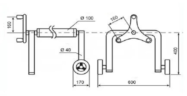 De afstand tussen de wielen is 600 mm, de hoogte van de telescopische stang vanaf de grond is 400 mm en de stang is extra versterkt met een diameter van 100 mm (standaard lieren zijn ca. 80 mm).