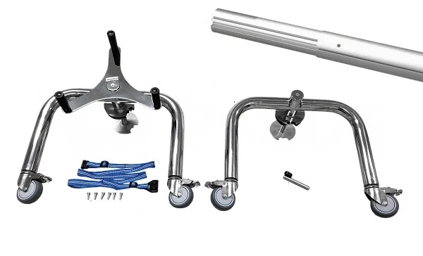 Dit rolgordijn is verrijdbaar 4WD — aan beide zijden U-vormige steunen op wielen. De telescopische stang is in lengte verstelbaar, geschikt voor elk zwembad met een breedte van 6,4 tot 8,6 meter. Het stuurwiel kan aan elke kant van de jaloezie worden geïnstalleerd.