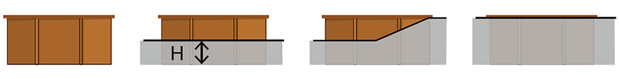 Deze Lemon houten zwembad kan op 4 verschillende manieren worden geïnstalleerd. Volledig verhoogd - gebruikmakend van de buitentrap naar het zwembad, half begraven, gedeeltelijk begraven of volledig begraven op grondniveau.