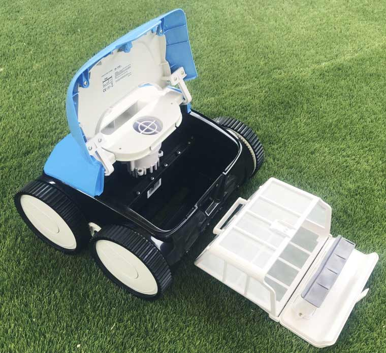 Deze Leopard Connect heeft 4 wiel aandrijving en getande vorm, een systeem dat perfect werkt op de bodem van het zwembad en effectief over de wanden glijdt. Het heeft een filter met een inhoud van 3 liter en is heel gemakkelijk schoon te maken, op te vangen en opnieuw te gebruiken. Door op de knop te drukken wordt het filter van bovenaf verwijderd. We moeten hem uit het water halen, schoonmaken met behulp van een waterslang en hij is klaar voor gebruik.
