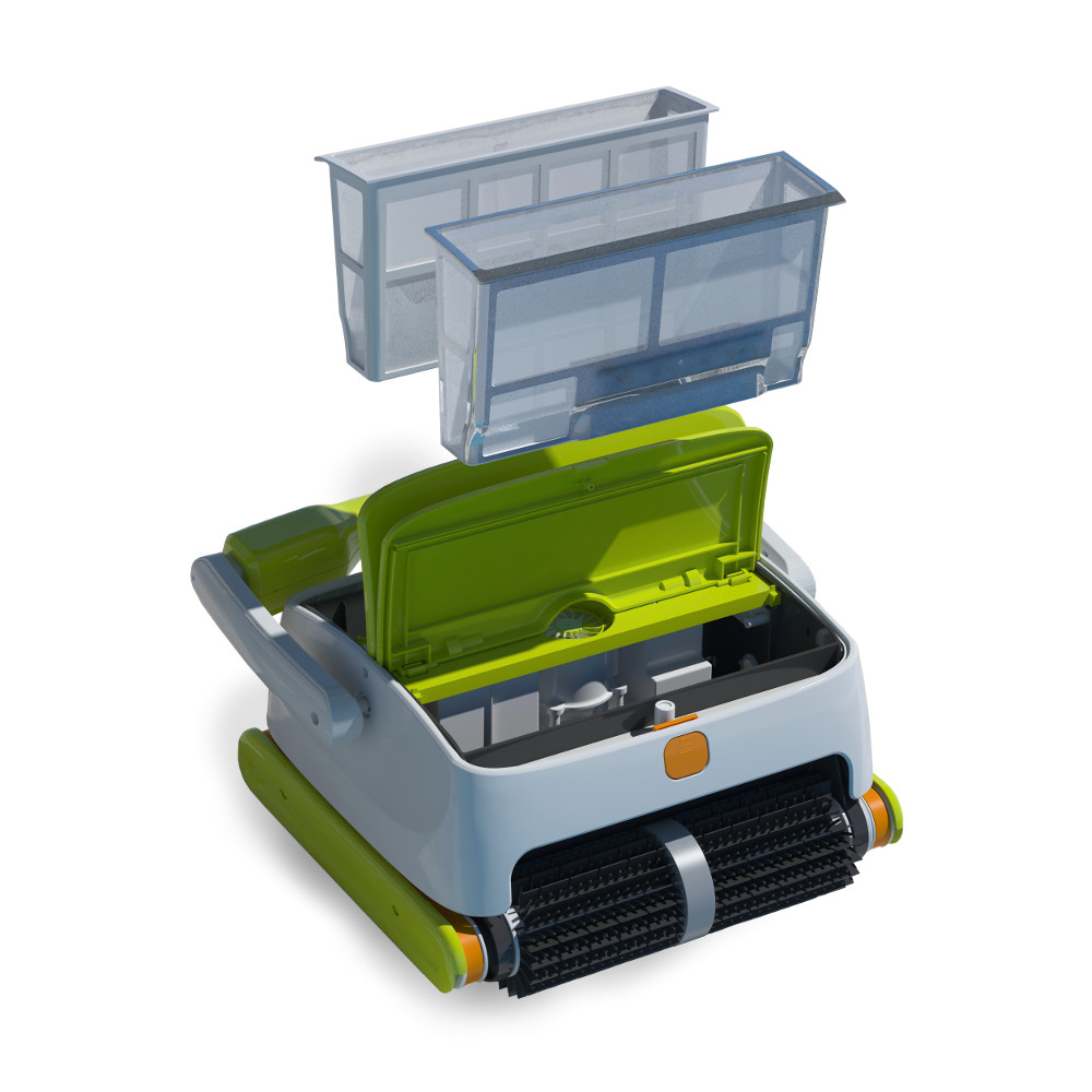 Draadloze reiniging van bodem, wanden en de waterlijn voor uw zwembad tot 15 meter in lengte. Het bevat een oplaadbare lithiumbatterij met hoge capaciteit en een intelligent gyroscoopsysteem waarmee u een intelligente route kunt maken die zich aan uw zwembad aanpast, zodat u elke cyclus beter kunt benutten.