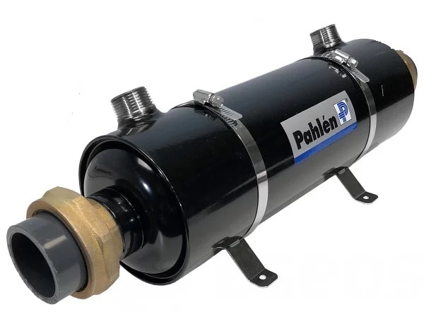Voor aansluiting op de secundaire kring met zwembadwater wordt een 2" binnendraad gebruikt . Hierop moet een messing fitting met een PVC-uiteinde worden aangesloten, waarin vervolgens een 63 mm buis wordt gelijmd. Door de hoge temperaturen van de warmtewisselaar , gebruik geen PVC-fitting, maar een koperen fitting, anders kan de schroefdraad losraken en het water laten stromen.