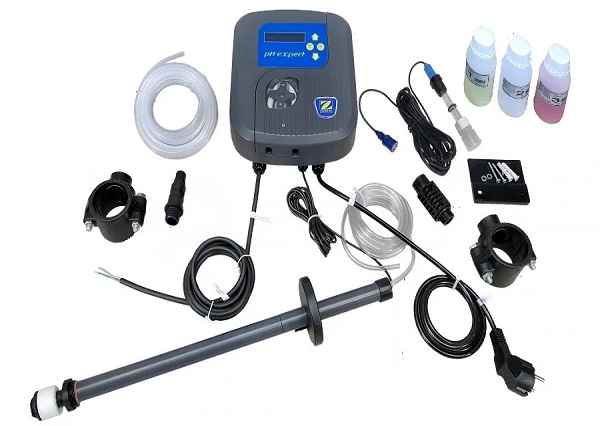 Besturingseenheid met pomp, zuig- en afvoerbuis voor chemie, zuigstang uit vat chemie, injector met buishouder, pH-sonde, pH-sondehouder, kalibratieoplossingen voor pH-sonde, onderdelen voor bevestiging van de besturingseenheid aan de muur, stroomkabel.