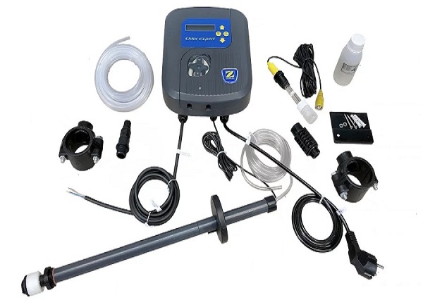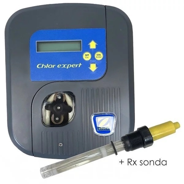 Besturingseenheid met pomp, aanzuig- en afvoerslang voor chemie, zuigstang uit een vat chemie, injector met leidinghouder, redox-sonde, redox-sondehouder, 465 mV ijkoplossing voor Rx-sonde, onderdelen voor bevestiging van de besturingseenheid aan de muur, Stroomkabel.