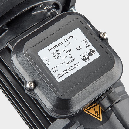 De Speck Pro Pomp 11 is een zwembadpomp die zichzelf kan ontluchten- zelfaanzuigend en daarom ook geschikt is voor installatie boven het waterniveau. Om dit te doen, moet het voorfilter eerst worden gevuld met water. Als de pomp nu aan staat, transporteert deze continu lucht, maar niet het water uit het voorfilter - uit de zuigleiding en trekt het zwembadwater langzaam omhoog vanwege de resulterende negatieve druk totdat de waterkolom wordt geproduceerd.