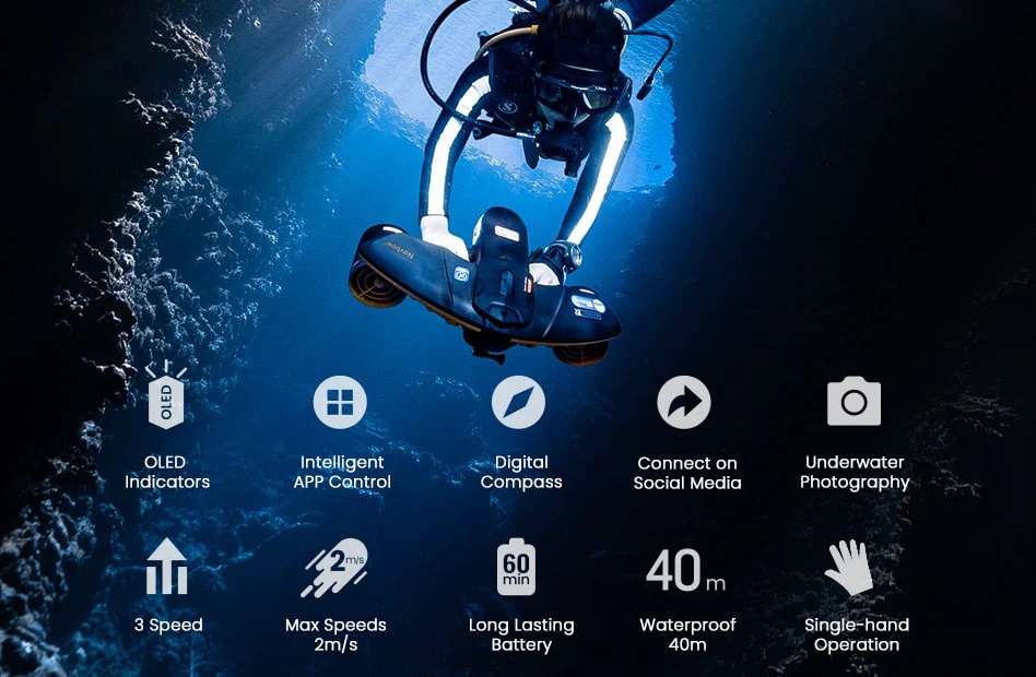 • Uitgerust met schakelaars met 3 snelheden, een digitaal kompas, intelligente APP-bediening en meer om je duikervaring naar een hoger niveau te tillen.