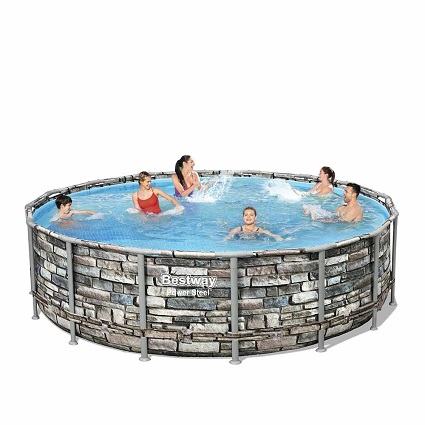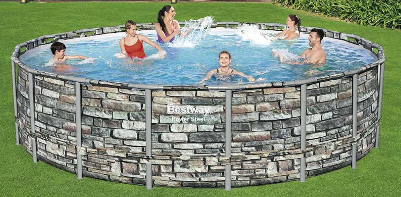 Bestway presenteert exclusief het Swing Elite Frame Stone design zwembad voorzien met een diameter van 488 cm en een diepte van 122 cm. Dit buisvormige zwembad heeft een innovatief imitatie-stone ontwerp dat zich opvallend onderscheidt van de traditionele PVC-baden in de kleur blauw.
