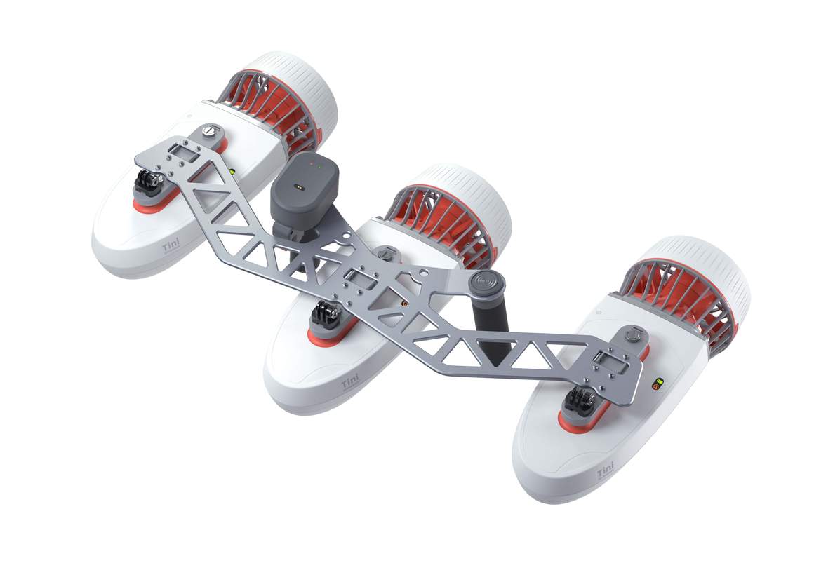Met het verwisselbare ontwerp van WhiteShark Tini Triple-Engine Support Handle kun je drie WhiteShark Tini-scooters combineren. Door drie WhiteShark Tini-scooters aan te bevestigen, kan de duiker door het water manoeuvreren, waardoor het 's werelds snelste scooter op de markt is.