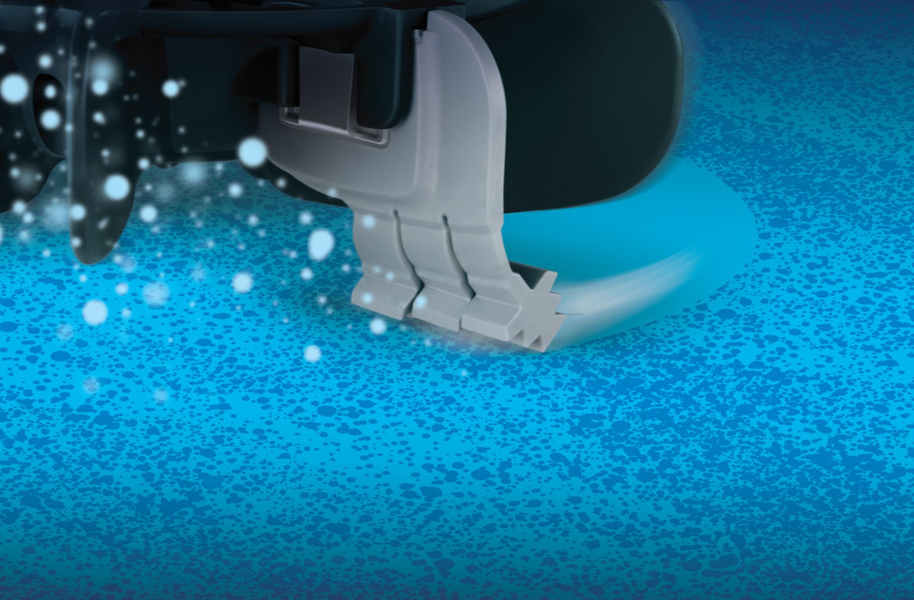 De MX10™ zwembadreiniger heeft een turbozuigsysteem, een krachtige zuigturbine en twee zuigpropellers met borstels die vuil en zand naar de mond van de robot leiden. Dit garandeert een ultra-effectieve reiniging, zelfs bij lage stroomsnelheden.